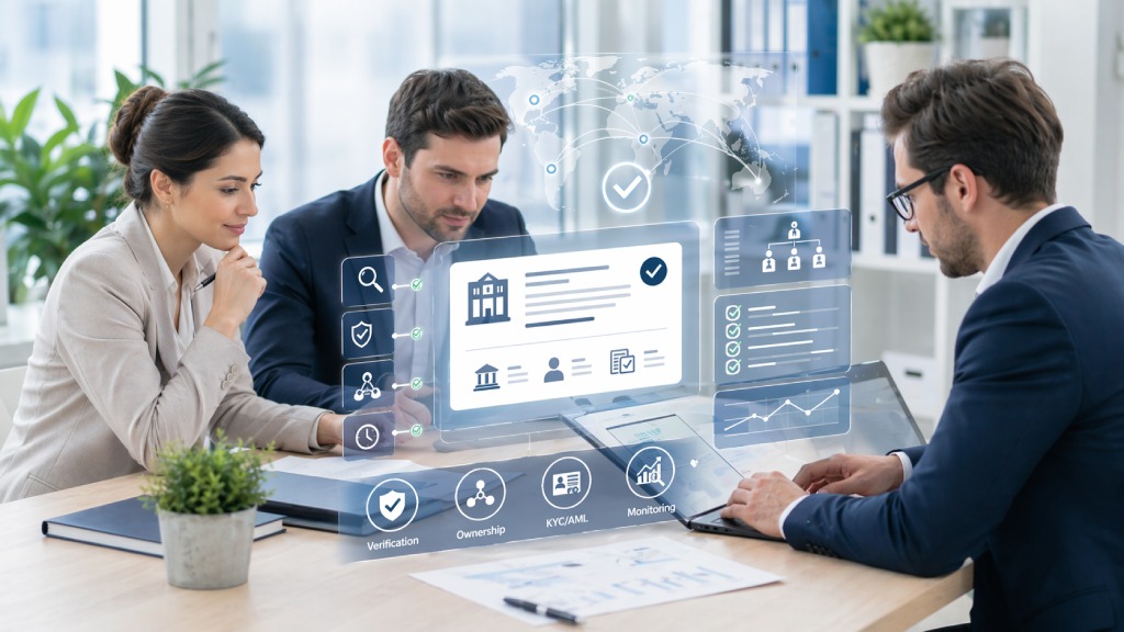 This is where regulated industries spend most of their time. Banks, brokers, payment institutions, and law firms must perform corporate KYC and anti-money-laundering (AML) checks before onboarding any business client. Compliance due diligence verifies the legal entity, its directors, its ultimate beneficial owners, and its standing with regulators.